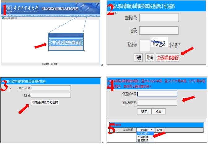 查询方式:登录“http://yjszs.lnutcm.edu.cn:7777/zsgl/bswb/default.aspx”系统:第一步,点击“考试成绩查询”;第二步,点击“忘记编号或者密码”;第三步,输入身份证号和姓名,获取申请编号和密码;第四步,登录后按系统要求修改密码方可查询成绩。